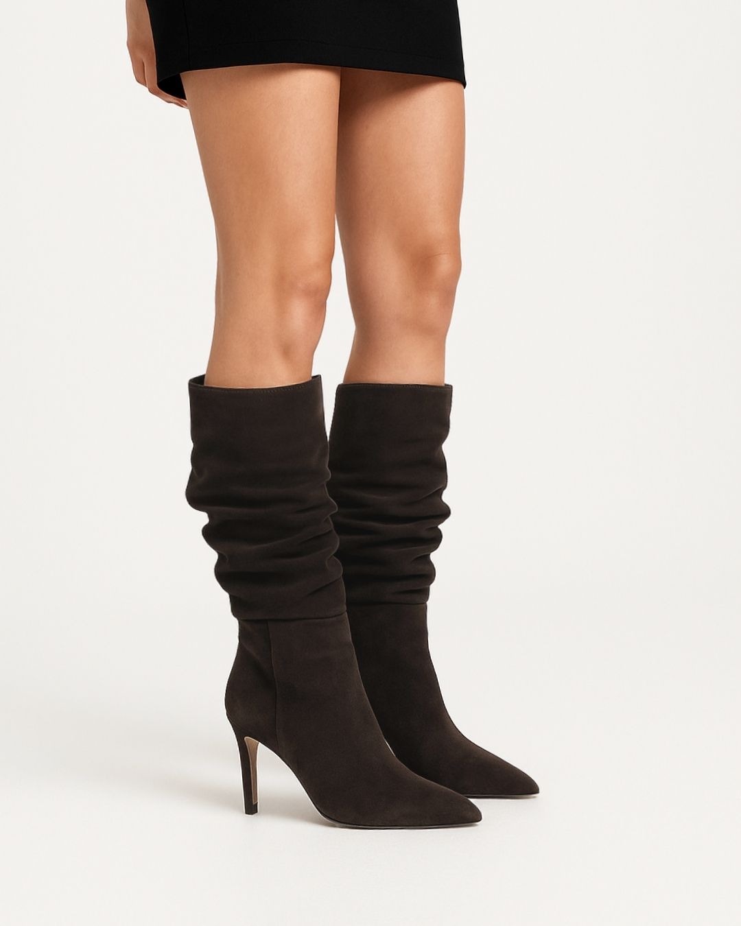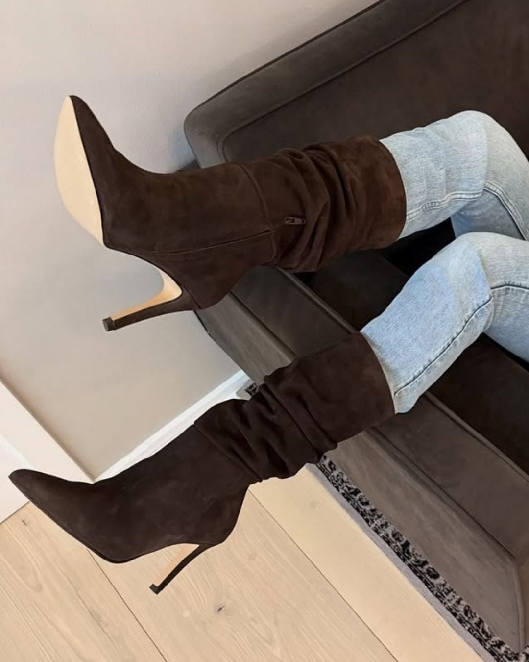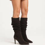 Træd ind i sæsonen med selvsikkerhed og stil i CELINE – den høje støvle, der kombinerer tidløs elegance med et moderne udtryk. Fremstillet i blødt mørkebrunt ruskind med en smuk, slouchy silhuet og en 8 cm høj hæl, der giver et sofistikeret løft uden at gå på kompromis med komforten.