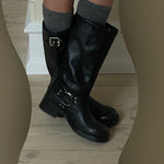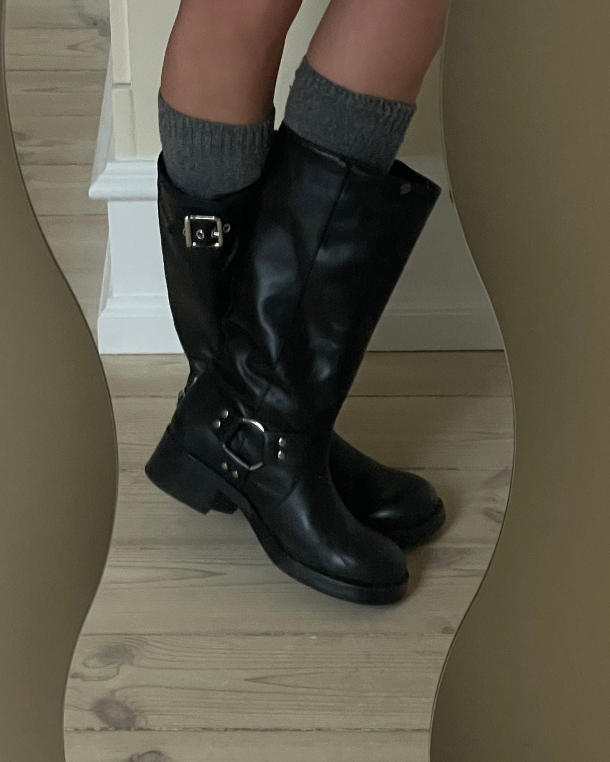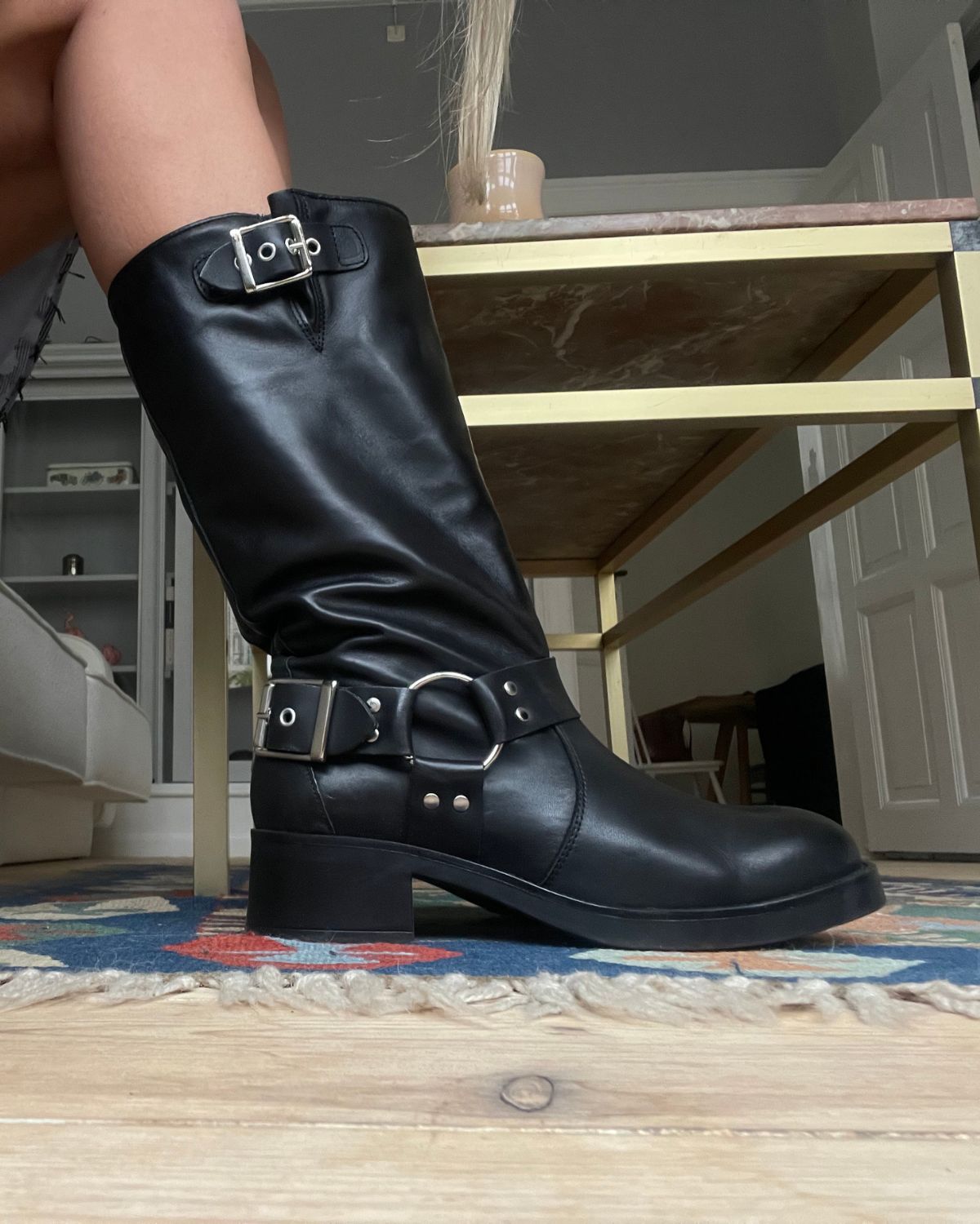 Saxy Biker Boots, er en støvle, der kombinerer tidløst design med en moderne biker-stil. Fremstillet i sort luksuslæder, tilbyder denne model en afrundet tå samt markante harness-detaljer omkring anklen og skaftet. Den justerbare spænde giver optimal komfort og et personligt fit. Med sin praktiske slip-on funktion er disse støvler lette at tage af og på. De rå metaldetaljer og robuste design tilfører et autentisk biker-look, perfekt til dig, der ønsker en stilfuld og kantet støvle.